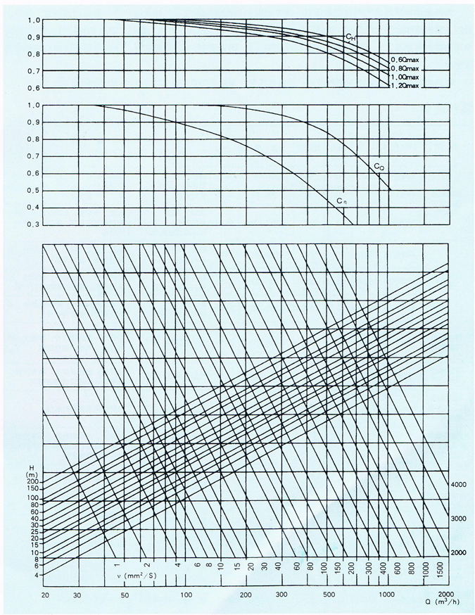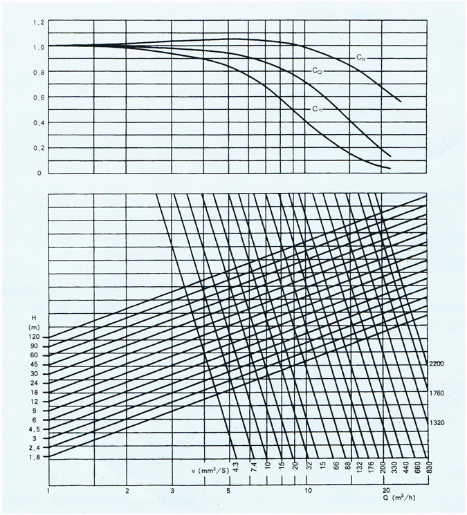 (1)根据要求的流量Q、扬程H、查下图得粘性介质修正系数CQ、CH、CTI。